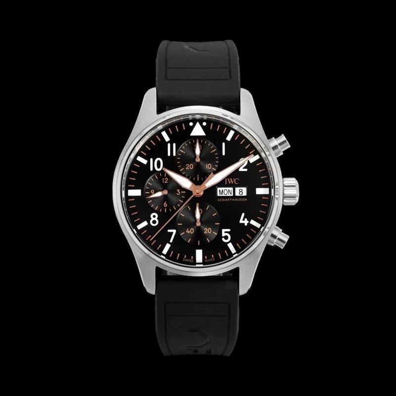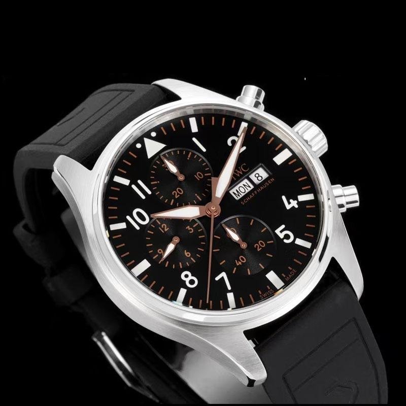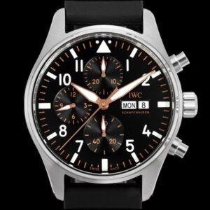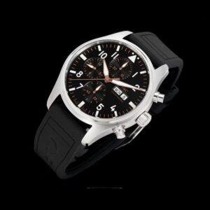 This top-of-the-line 1:1 clone IWC Pilot’s Chronograph (model IW388116) interprets the aesthetics of motorsport with a 41mm exquisite case diameter. The black dial is paired with eye-catching white and gold Arabic numeral hour markers, providing clear time reading and visual impact. The innovative combination of rubber strap and stainless steel case is light, durable and full of sportiness, perfectly matching racing culture enthusiasts and casual daily outfits.