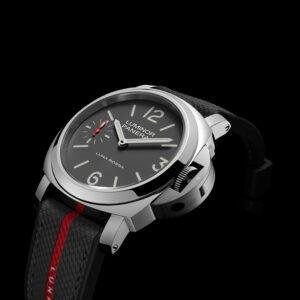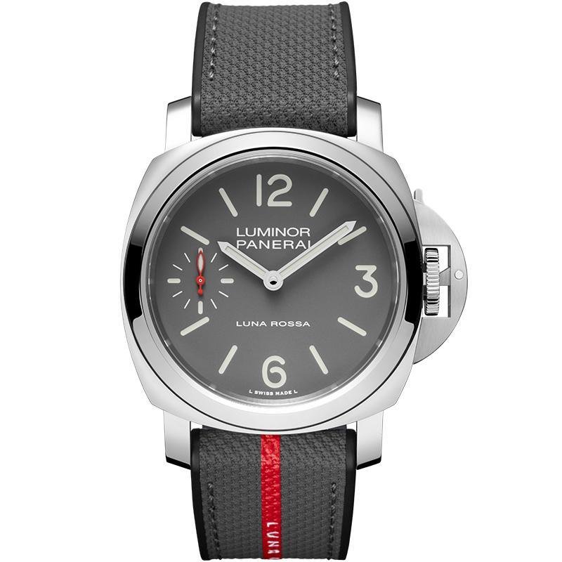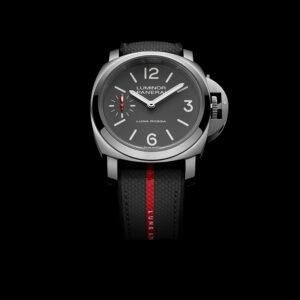 This top-of-the-line 1:1 clone Panerai Luminor Luna Rossa special edition watch (model PAM01653) pays tribute to the legendary America’s Cup sailing team with its iconic 44mm case diameter. The unique grey dial is calm and profound, complemented by eye-catching Arabic numerals and hour markers, continuing the brand’s classic Marine instrument aesthetics while integrating the modern touch of the event collaboration theme.