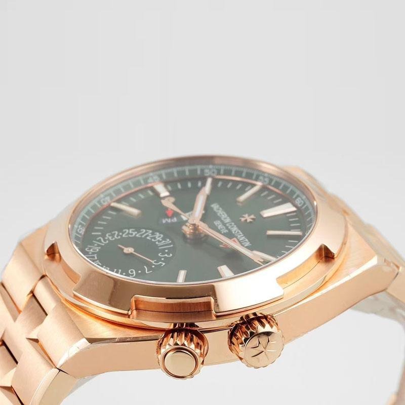 【Top Clone Vacheron Constantin 7920V/210R-B965】A 1:1 replica of the classic Overseas Dual Time Pink Gold, a must-have for Vacheron Constantin collectors! The 41mm diameter fits most wrist sizes, with a unique textured green-plated dial and a transparent, wear-resistant sapphire crystal, showing luxurious style in simplicity, suitable for both business and casual occasions.