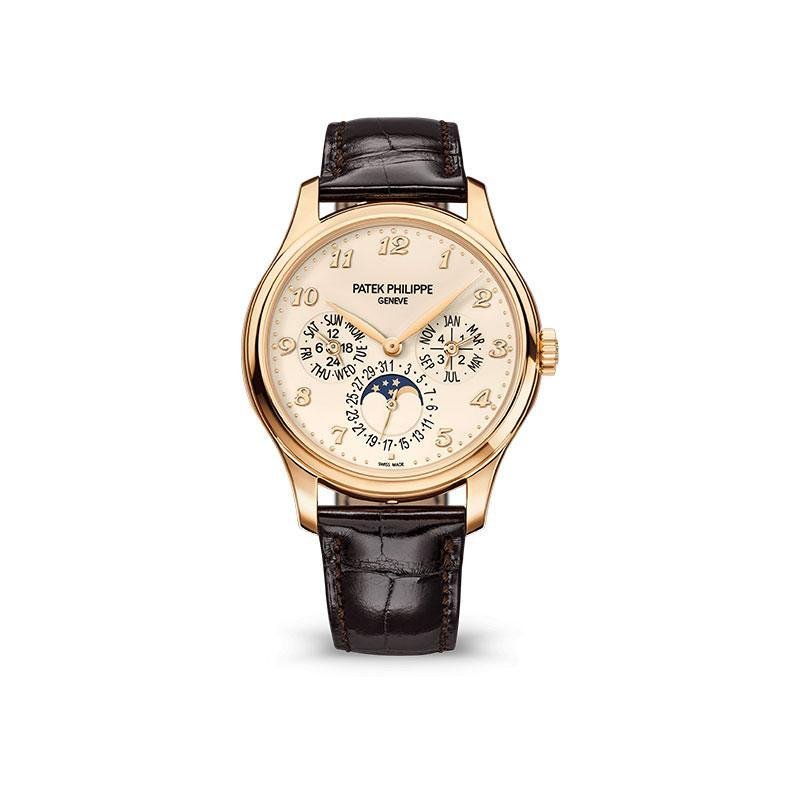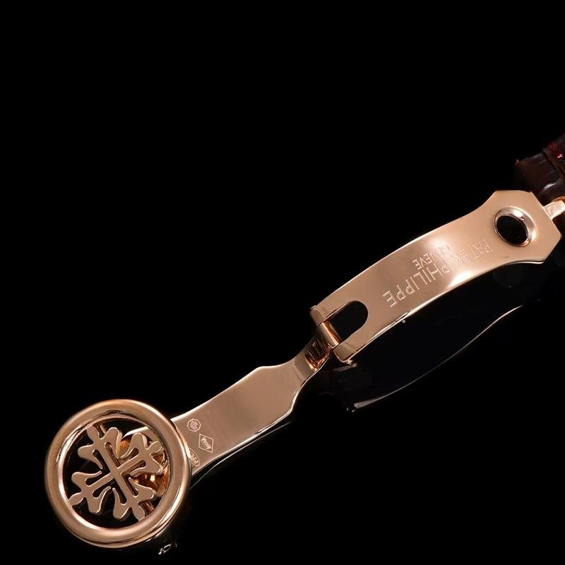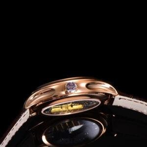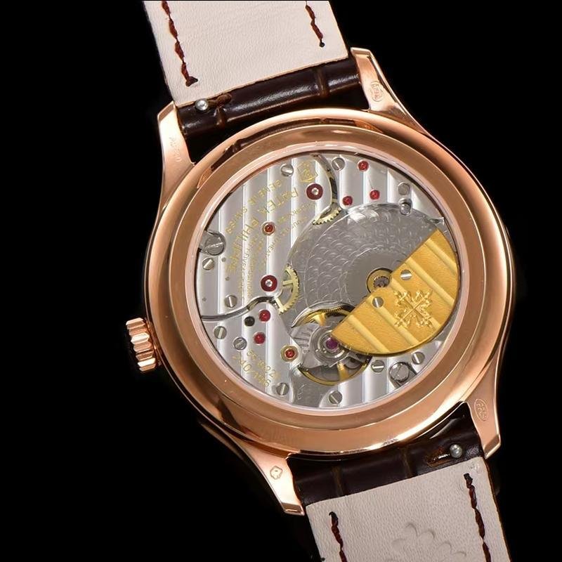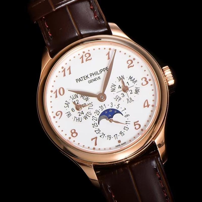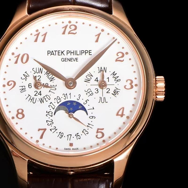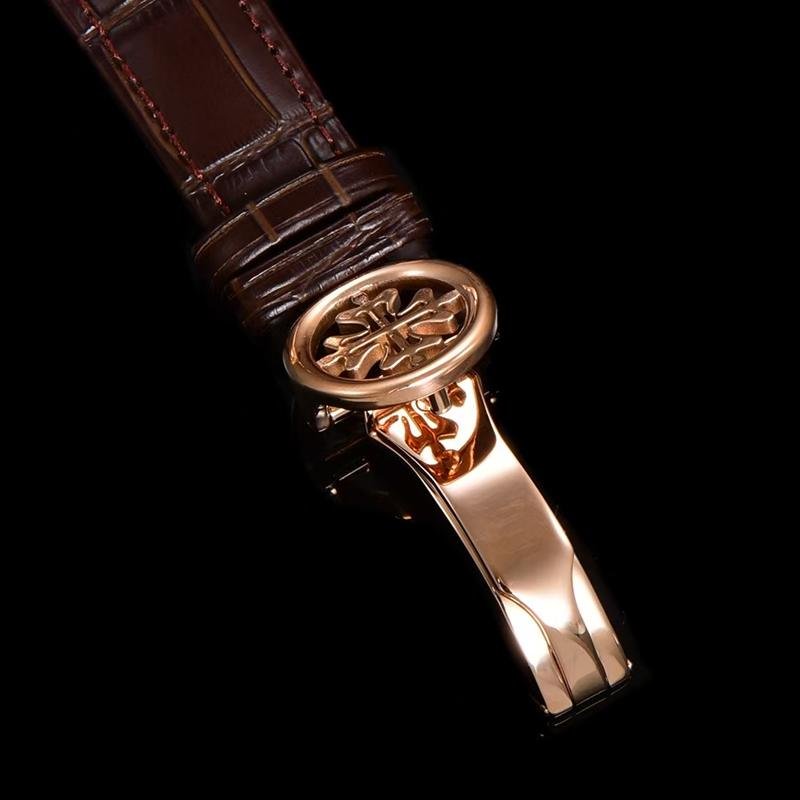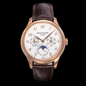 Top 1:1 clone Patek Philippe Grand Complications 5327R-001 rose gold replica watch, high-imitation masterpiece perfectly restoring the original classic luxury. 39mm stainless steel case finely polished, creamy lacquered dial elegant and delicate, equipped with high-imitation Cal.240 Q self-winding movement integrating perpetual calendar moon phase complications: month and leap year at 3 o’clock, pointer date surrounding true moon phase at 6 o’clock, day and 24-hour at 9 o’clock, precise and stable operation. Sapphire crystal anti-glare and scratch-resistant, cowhide leather strap soft and comfortable, exquisite craftsmanship with every detail like sub-dial layout, blue leaf hands, starry moon phase background 1:1 perfectly replicated from original Patek Philippe 5327R-001. Premium Patek Philippe replica perpetual calendar moon phase watch, top quality, luxurious appearance and feel, supports worldwide fast shipping with anonymous packaging for privacy. High cost-performance for Patek Philippe Grand Complications rose gold eternal charm!