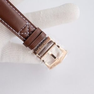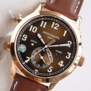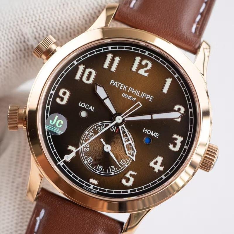 Sapphire glass crystal wear-resistant and clear, protecting dial details; cowhide leather strap soft and durable for natural comfort. This clone Patek Philippe watch features superior craftsmanship—from pilot-style large crown to dial texture—every detail perfectly replicates the original, delivering luxury texture and mechanical enjoyment comparable to the genuine. The rose gold brown dial pairing is warm and rugged, highly sought after by aviation enthusiasts and collectors. The clone Patek Philippe Complications Calatrava Pilot Travel Time series is widely popular, a high cost-performance luxury choice. Supports global fast delivery with discreet packaging—own this rose gold pilot dual time zone masterpiece worry-free!