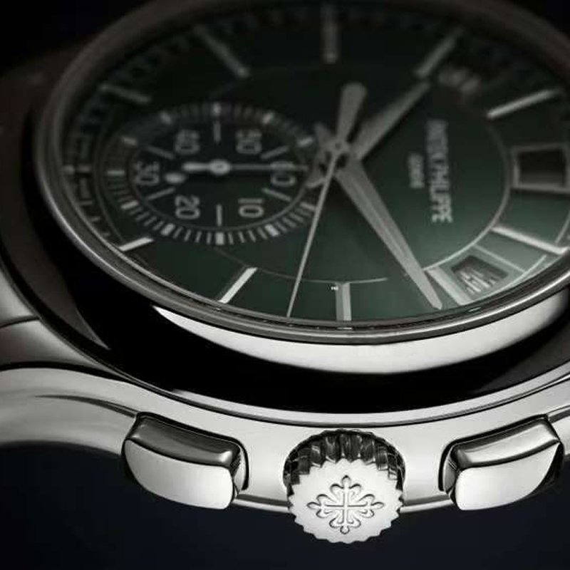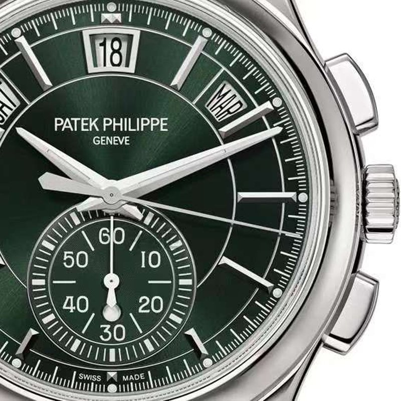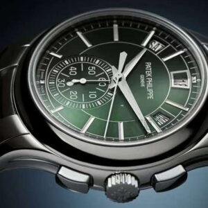 Top clone Patek Philippe Complications Steel 5905/1A-001 wristwatch,Hours, Minutes Flyback Chronograph with Central Chronograph Seconds Hand and 60-Minute Counter; Annual Calendar with Day, Date, Month, Day/Night Indicator, stainless steel case, 42mm in diameter, olive green dial, equipped with Cal.240 automatic movement, sapphire crystal glass, stainless steel strap, exquisite workmanship, every detail perfectly replicated, global fast delivery.