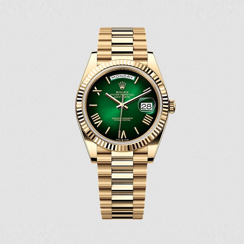 Equipped with reliable 2836 automatic winding movement, 1:1 high-imitation of original mechanical performance, ample power, precise stable timing synced with genuine daily. Elegant commanding 40mm diameter design. This cloning boutique reaches replication artistic pinnacle from gradient appearance to reliable movement, allowing enthusiasts affordable yellow gold green ombré presidential ownership, wrist highlight in business or gatherings. Top quality, infinite charm—collect now!