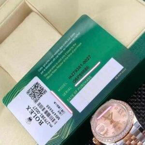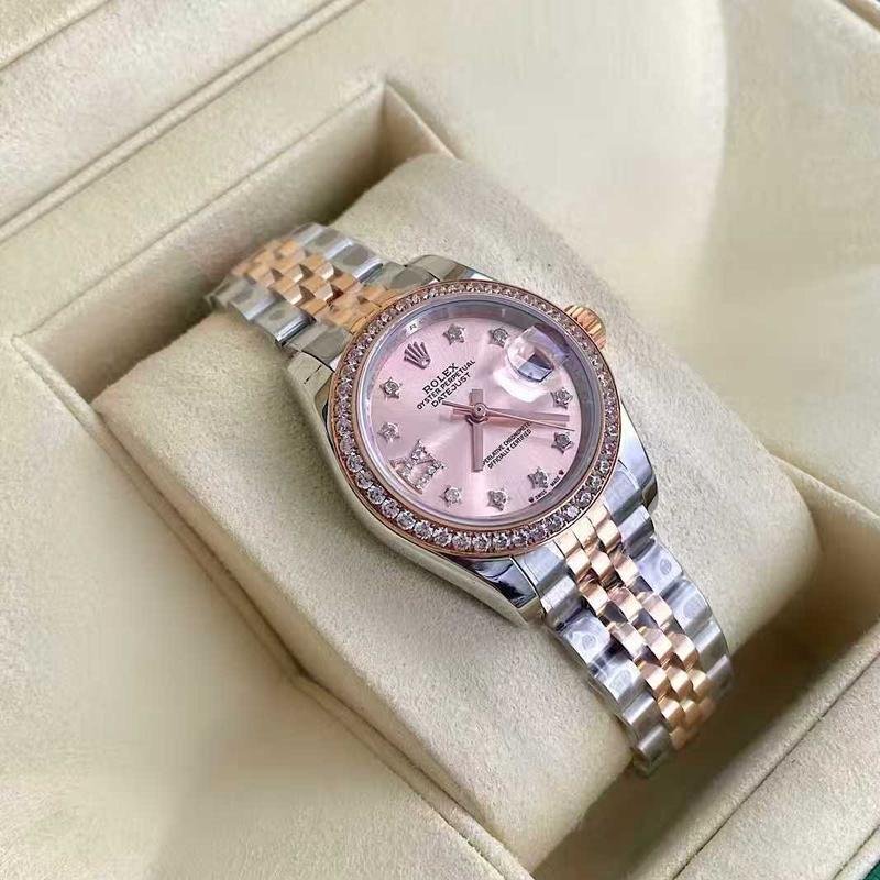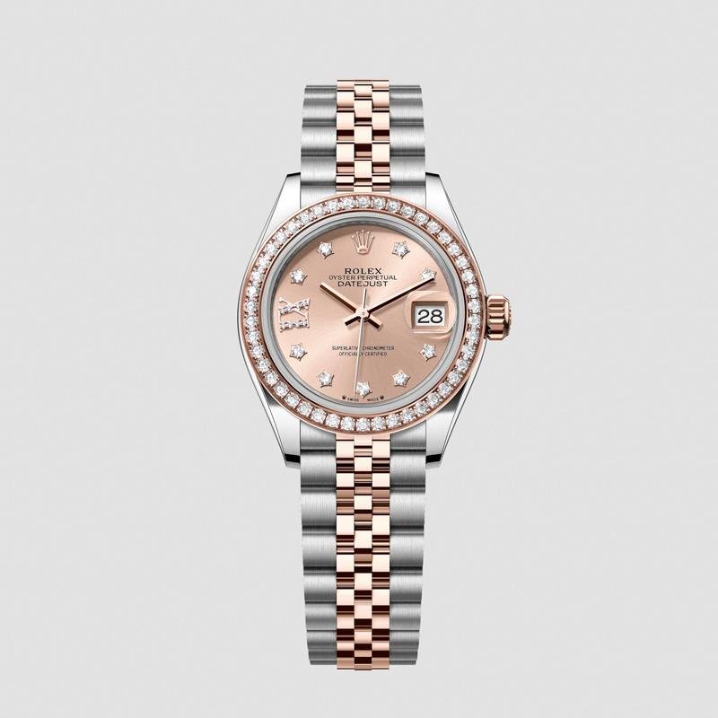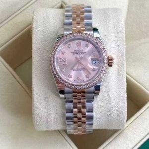 Crafted with 904L stainless steel and Everose rose gold accents, the watch delivers a warm, natural tone with premium finishing. The diamond-set bezel follows the exact layout of the authentic model, creating a subtle yet luxurious sparkle. The rose-colored diamond dial adds depth and sophistication, enhancing its overall harmony.