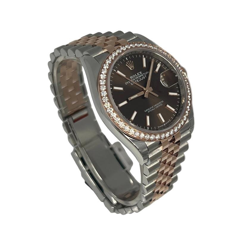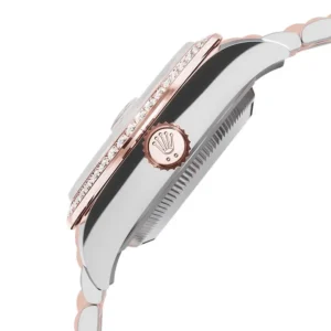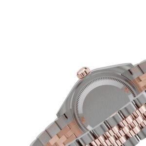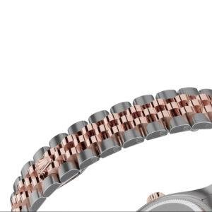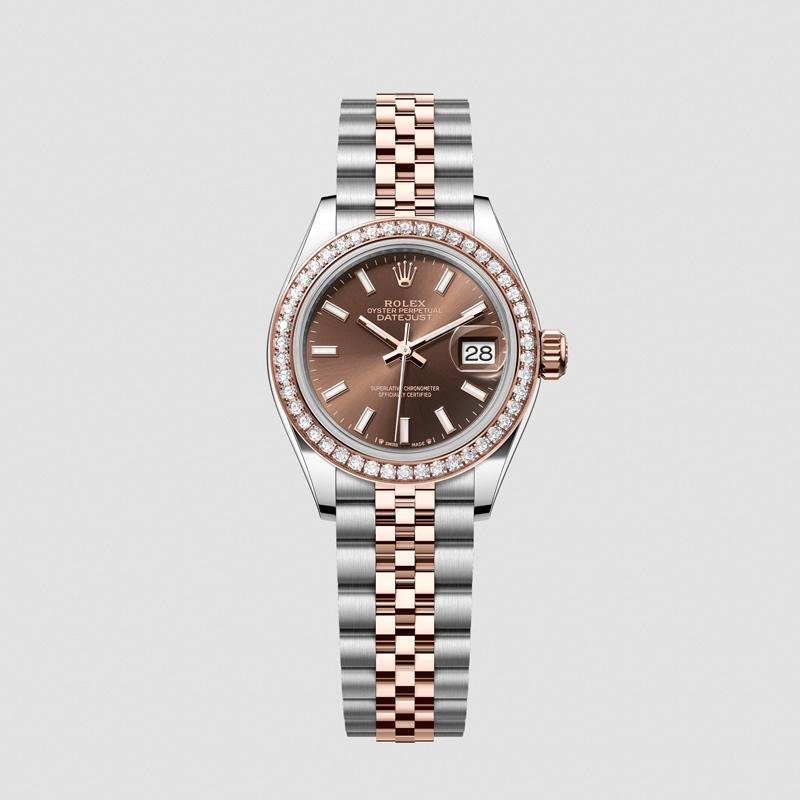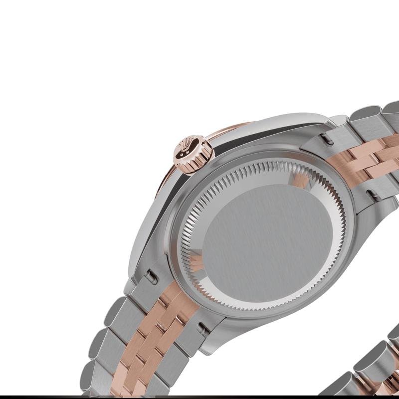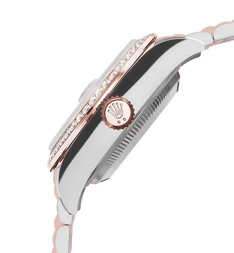 Crafted from 904L stainless steel with Everose rose gold accents, the watch delivers a warm and luxurious appearance. The diamond-set bezel is precisely aligned, producing a subtle and sophisticated sparkle. The chocolate dial adds depth and clarity, enhancing its feminine charm.
