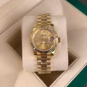 The Rolex Lady-Datejust m279178-0001 is a classic women’s timepiece featuring a champagne dial and a gold design that exudes exceptional luxury. This 1:1 high-quality replica not only replicates the appearance of the original but also mirrors its movement with remarkable precision, making it nearly indistinguishable from the genuine model.