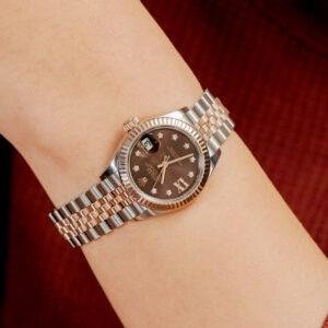 This 1:1 Master Clone Rolex Lady Datejust m279171-0003 perfectly captures the warmth and luxury of the Rolex women’s watch in a 28mm slim size. Stainless steel and Everyse gold Rolesor watch case are precisely polished, the weight and texture are infinitely close to the original, and the wrist naturally blooms with rose gold like soft luster. The chocolate color dial is deep and silky. The diamond time mark embedded under the sun radiation texture and the Roman IX shine brightly. The outer circle of the Everyse gold pit pattern and the diamond complement each other, showing a low-key luxury.