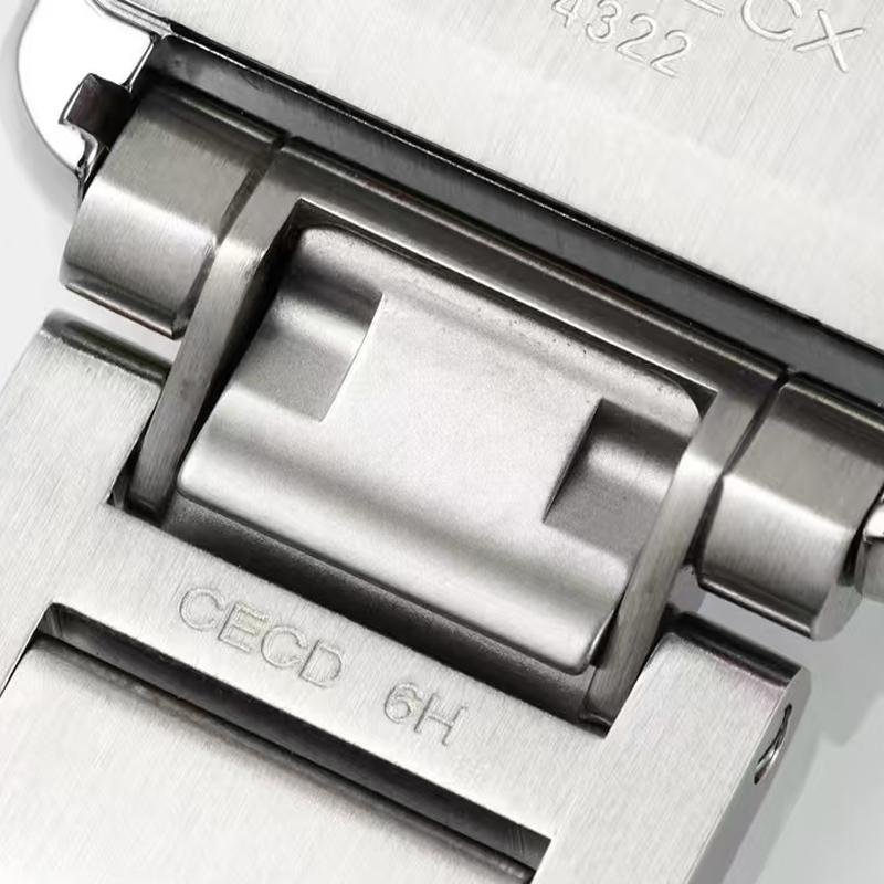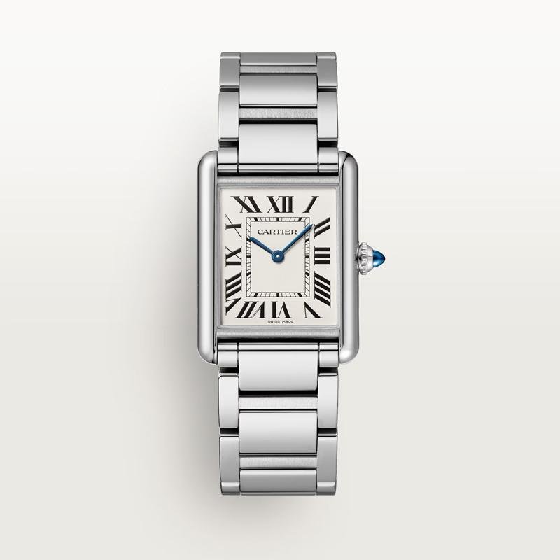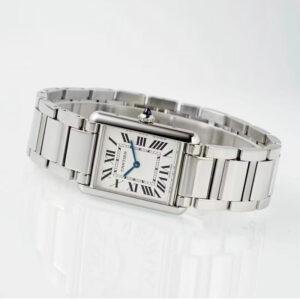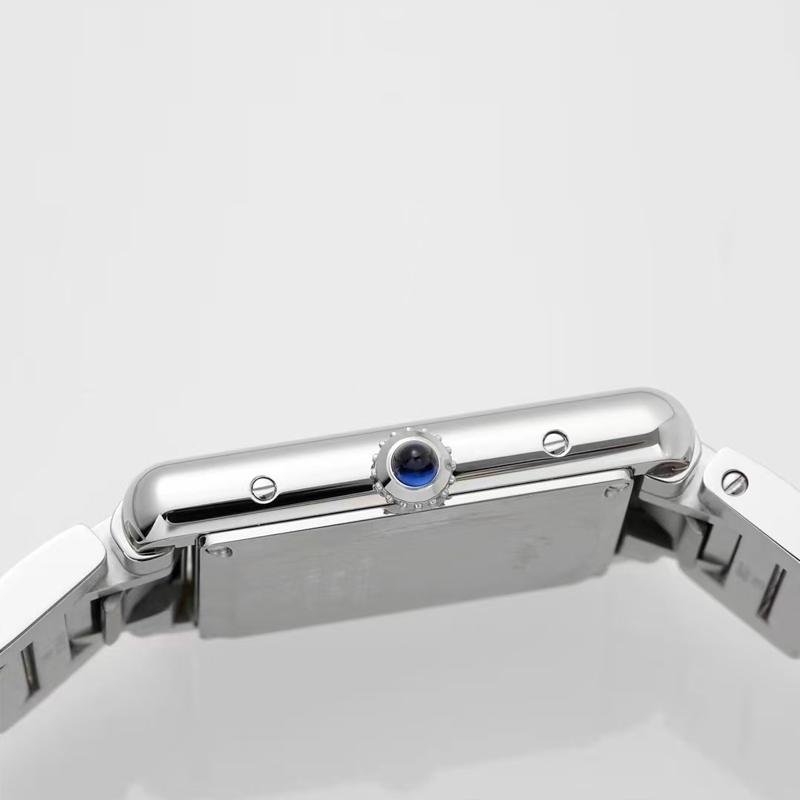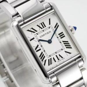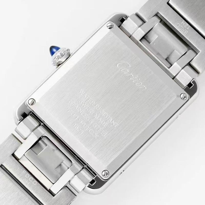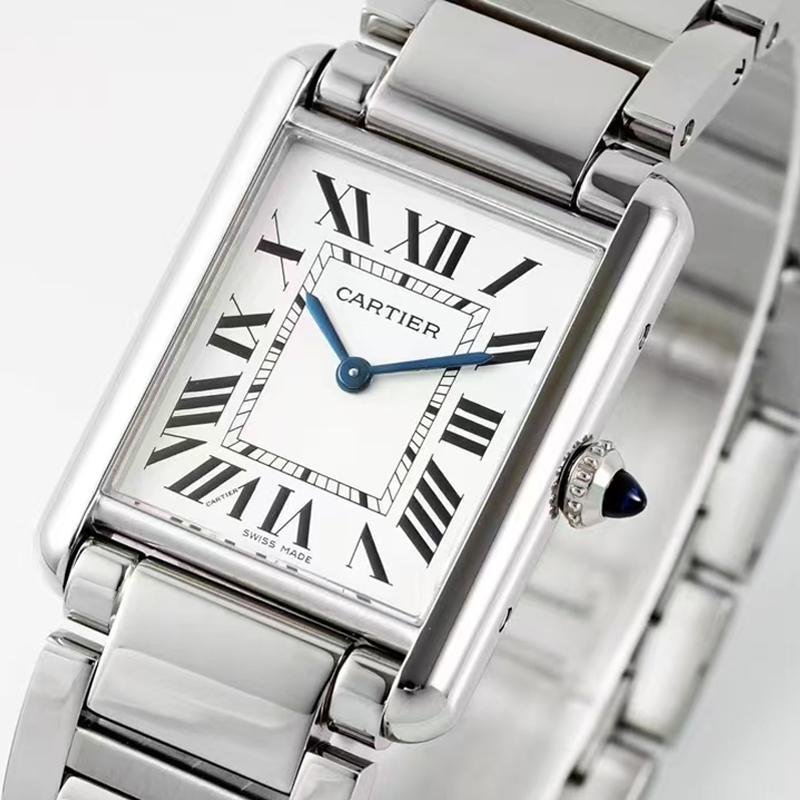 This watch is a model of 1:1 perfect reproduction. Its 33.7 x 25.5 mm steel case is fully synchronized with the original size and thickness, ensuring the original wearing experience and visual proportion. The classic silver dial and the simple track minute scale show the low-key luxury of Tank series. The integrated stainless steel strap further strengthens the overall texture and firmness.