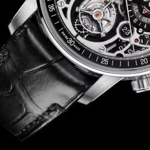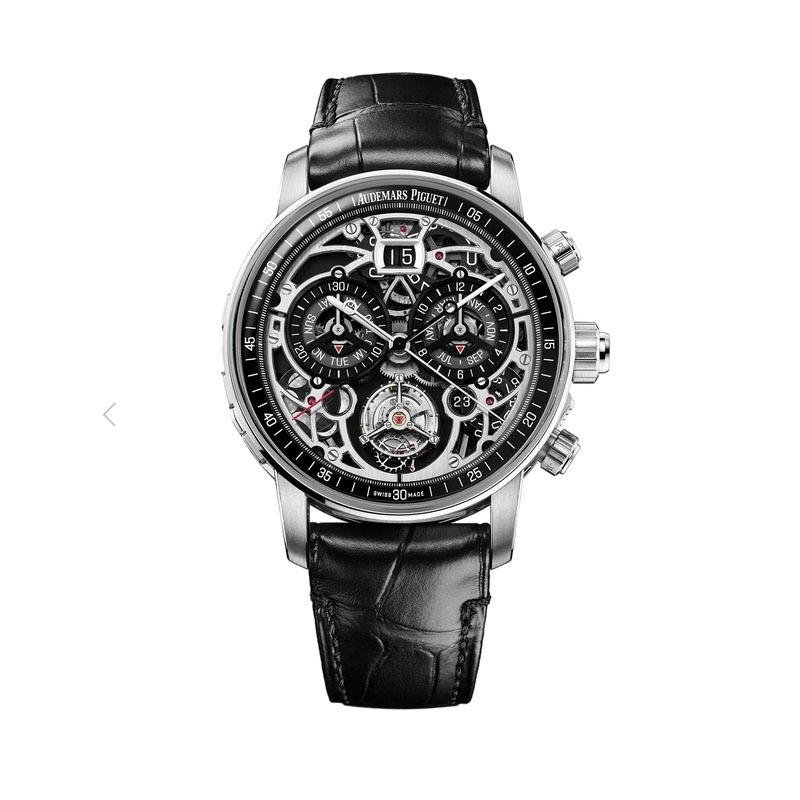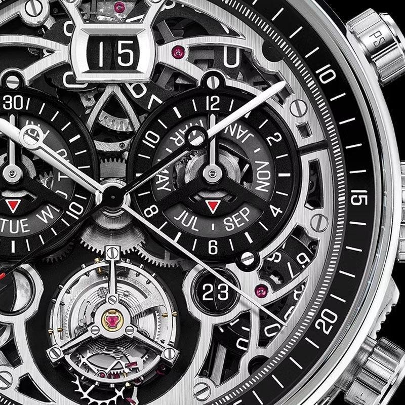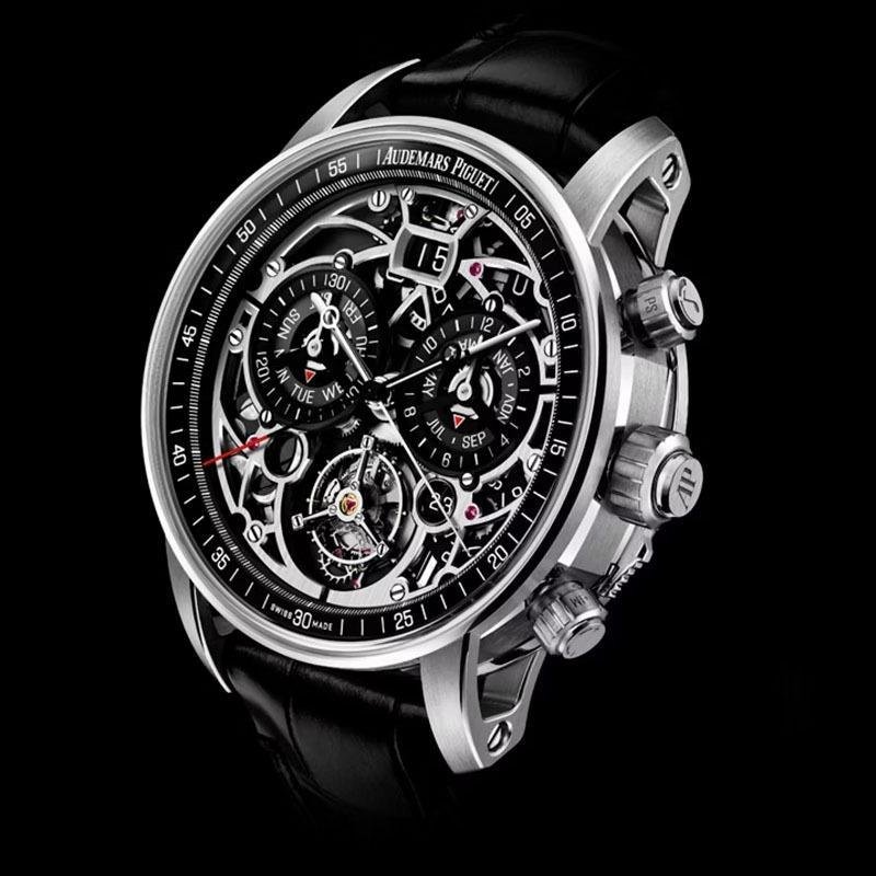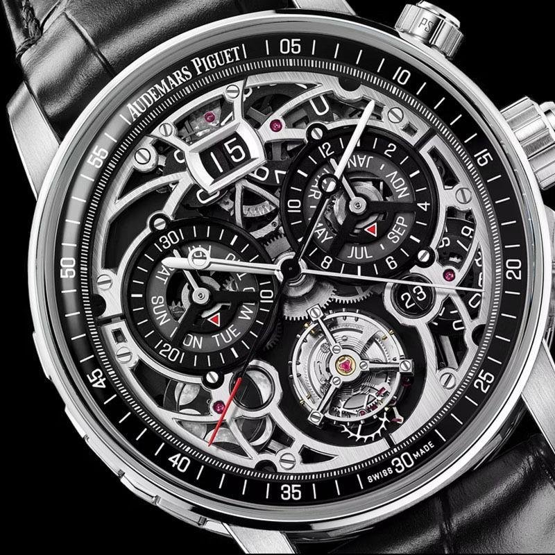 The Super clone Audemars Piguet 11.59 Complex Universe watch features a skeletonized dial that reveals the complexity of its advanced mechanisms, allowing collectors to understand the complexity and precision of its engineering. Adopting the modern and elegant Code 11.59 design, the 42mm case combines satin and polished effects, highlighting the beauty of its architectural style; It features a large Sonnera-style super sound system, minute repeater, perpetual calendar, seconds dial dual-shoulder chronograph and flying tourbillon, etc.