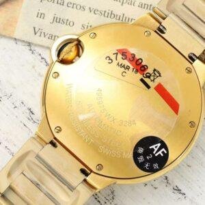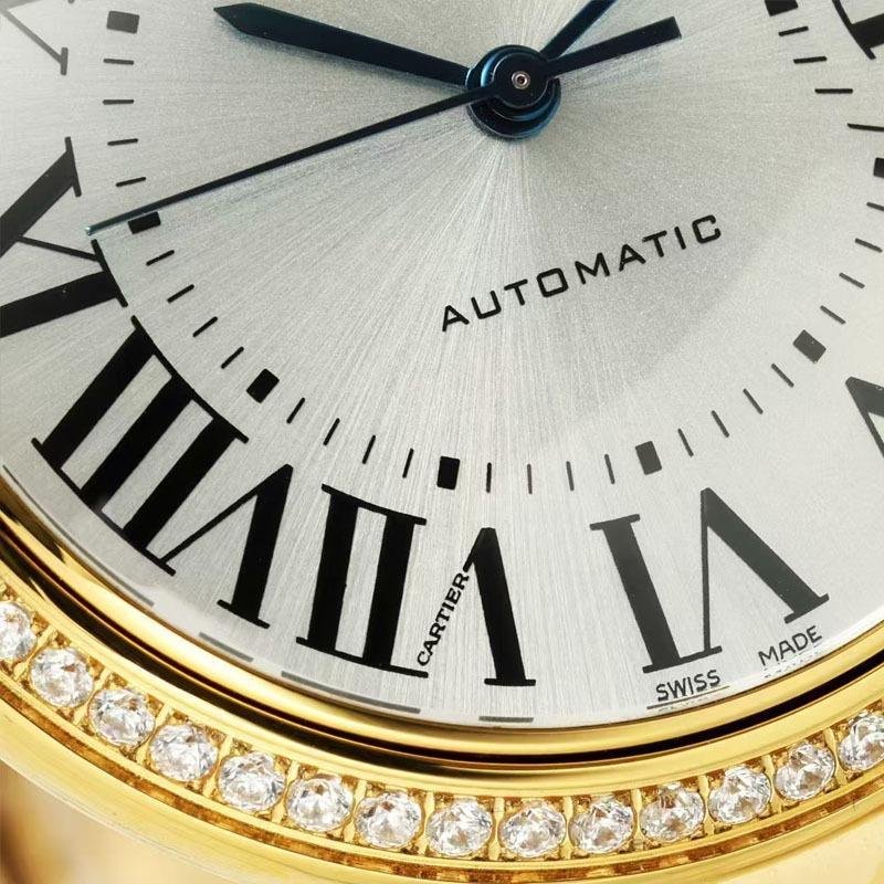 This top-of-the-line 1:1 replica Cartier Ballon Bleu watch (model WJBB0070) presents classic elegance with a diameter of 36 millimeters. Both the case and the bracelet are made of high-quality 316 stainless steel and treated with gold plating, shining with a luxurious luster. The silver guillose-patterned dial, paired with the signature sword-shaped blue hands and Roman numeral hour markers, showcases exquisite details under the transparent top-quality sapphire crystal.