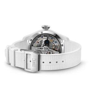 This top-of-the-line 1:1 clone IWC Big Pilot’s Watch Perpetual Calendar TOP GUN Lake Tahoe watch (model IW503008) showcases professional-level aviation complications with a stunning 46mm diameter. The watch features a signature white case, paying tribute to the ice and snow landscape of Lake Tahoe, and is paired with a white rubber strap, creating a sharp contrast and highlighting the modern military watch’s aesthetic and outstanding wear resistance.